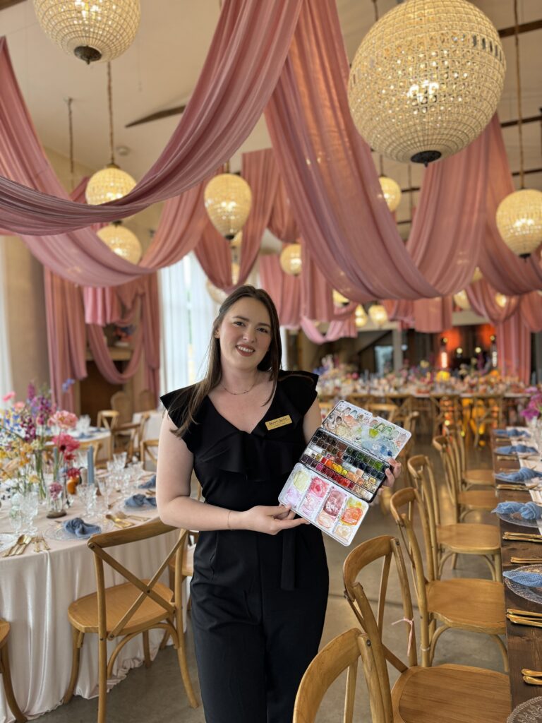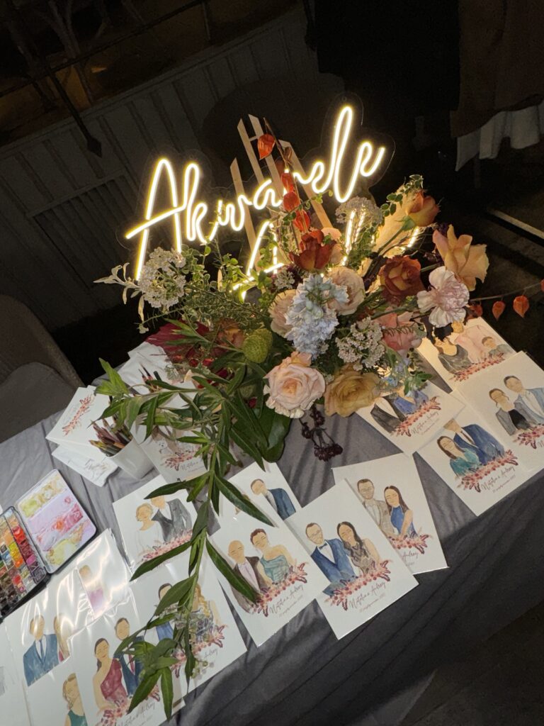 Pierwszą realizację weselną miałam we wrześniu 2023 r. i to właśnie wtedy upewniłam się, że malowanie na żywo jest czymś co kocham i idealnie się w tym odnajduję. Jestem osobą bardzo otwartą i przyjaźnie nastawioną do innych ludzi.