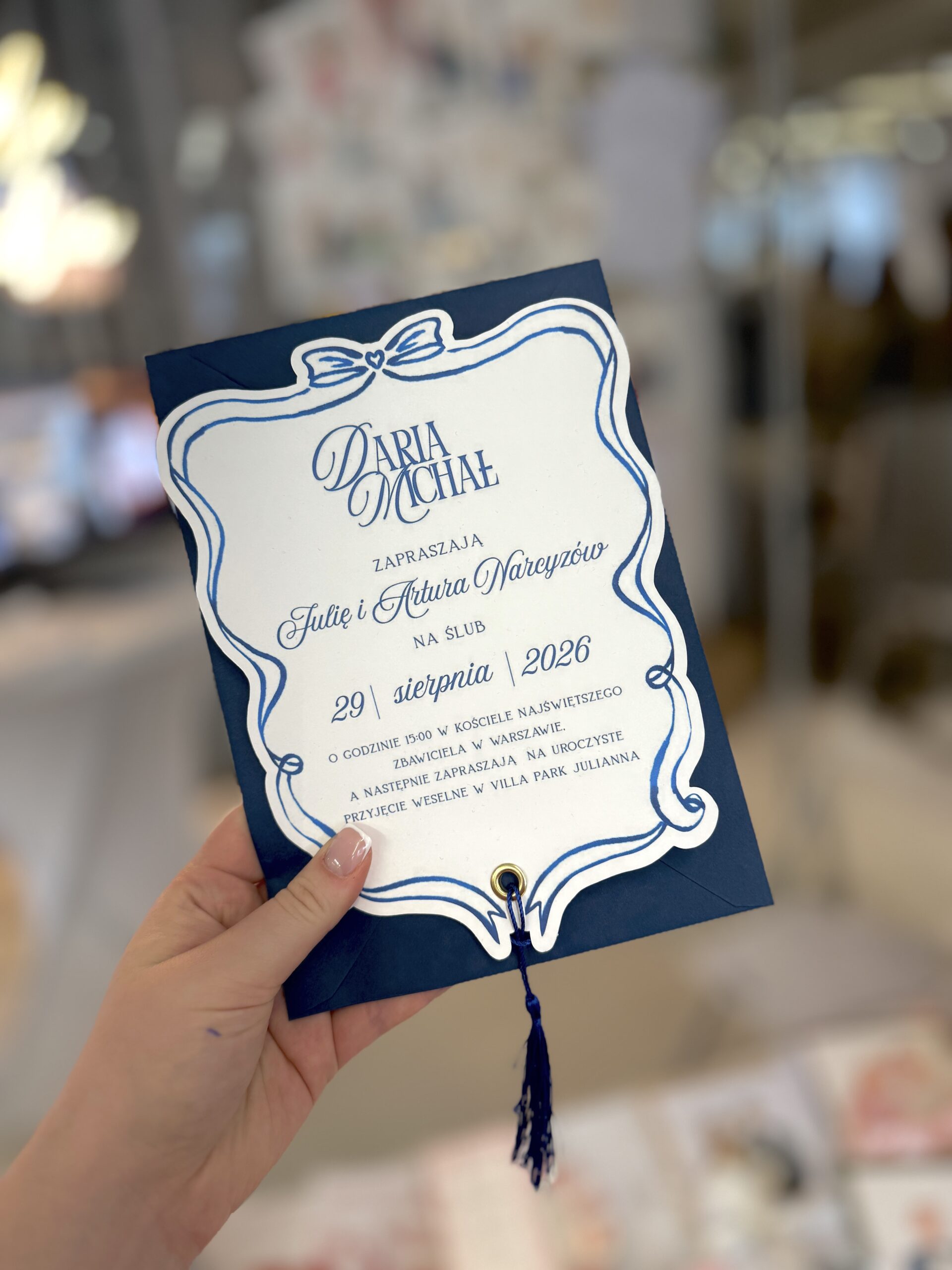 Papeteria o eleganckim motywie z kokardką i wstążką. W kolorze granatowym. Składa się z wyciętego zaproszenia , złotego pinu oraz chwostu.