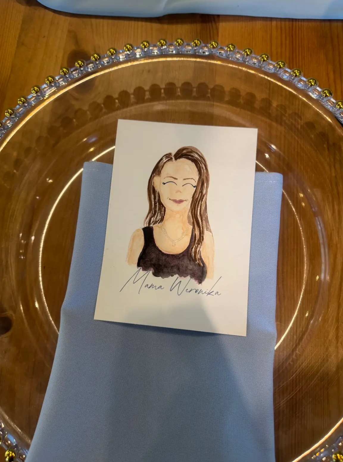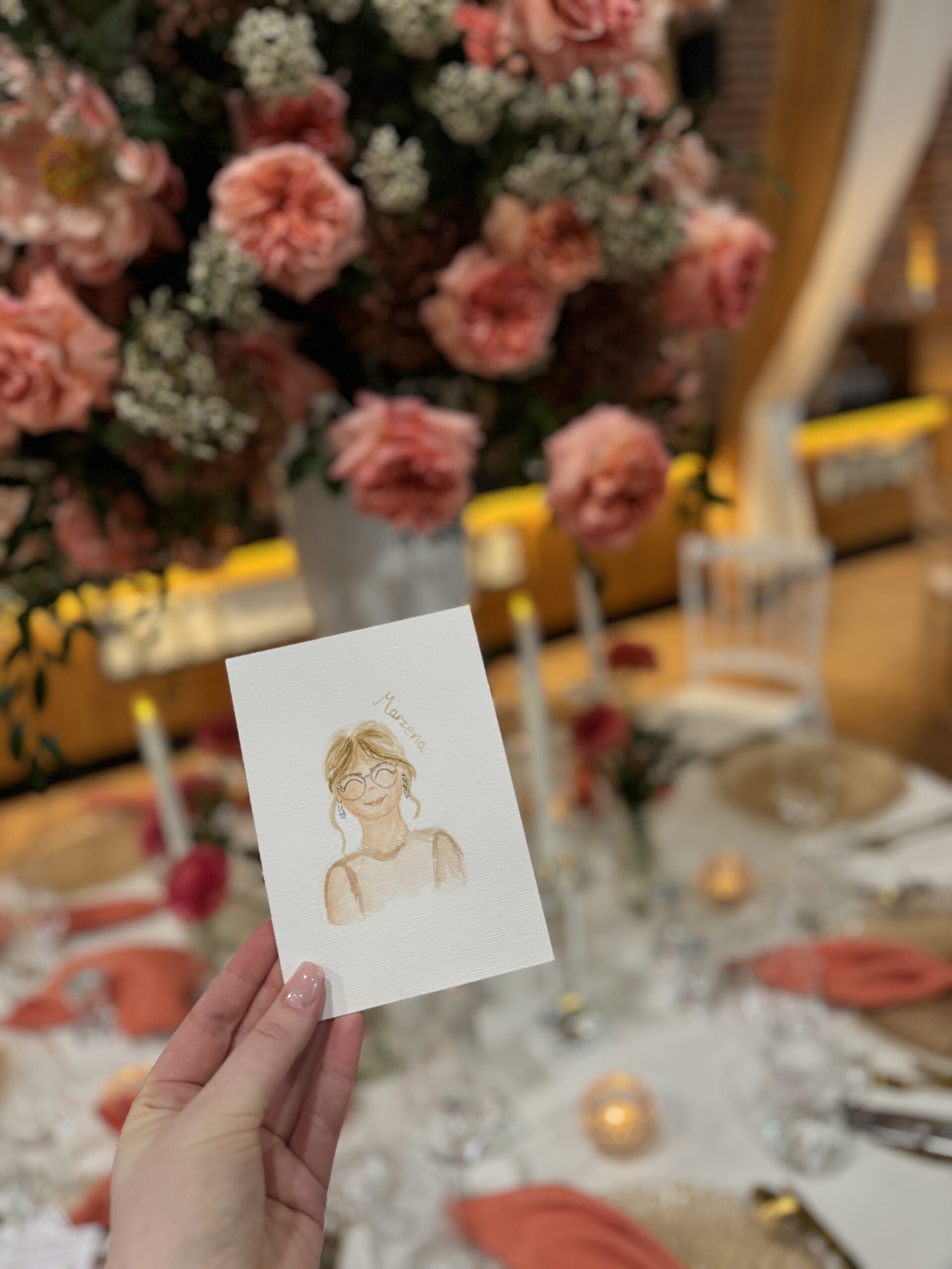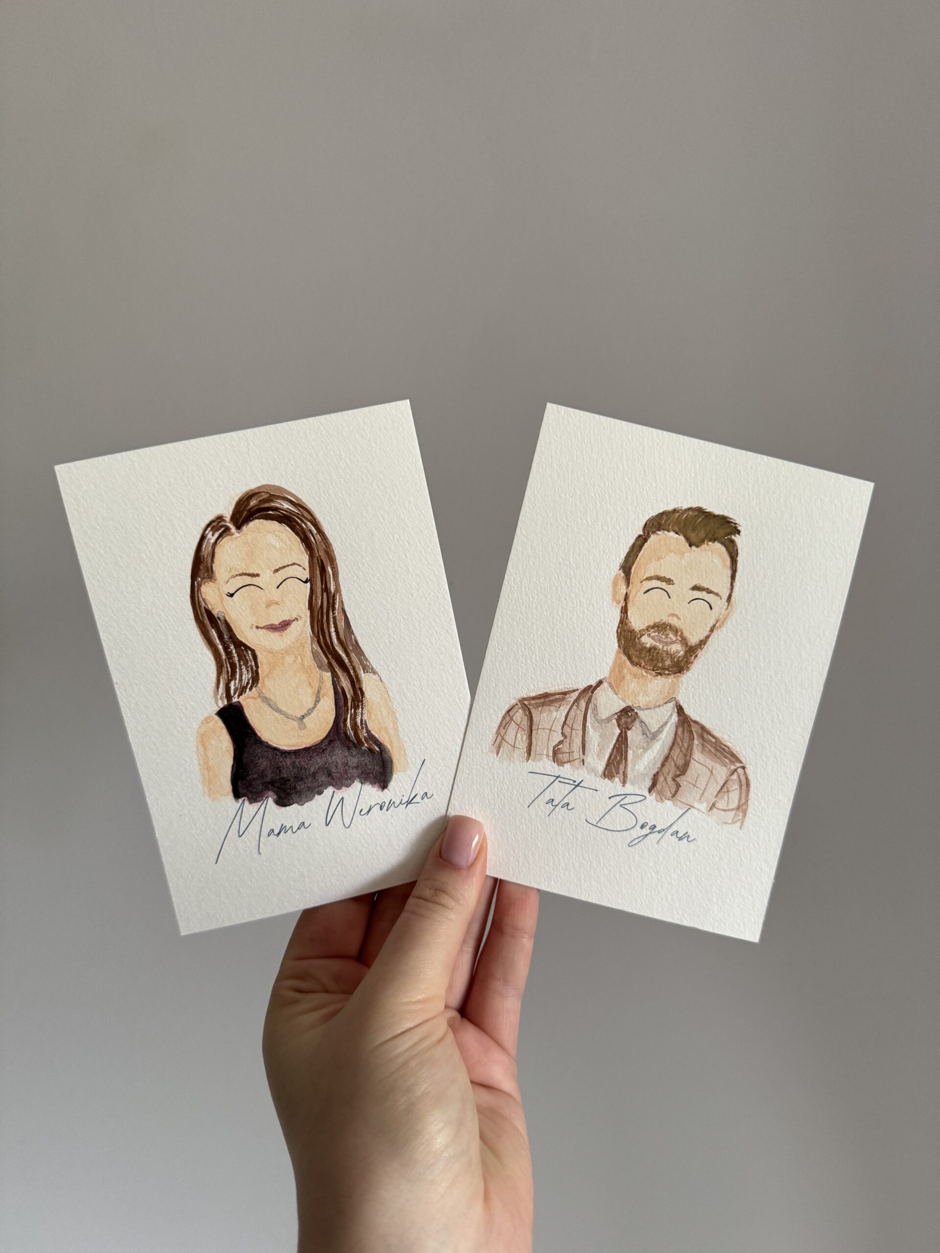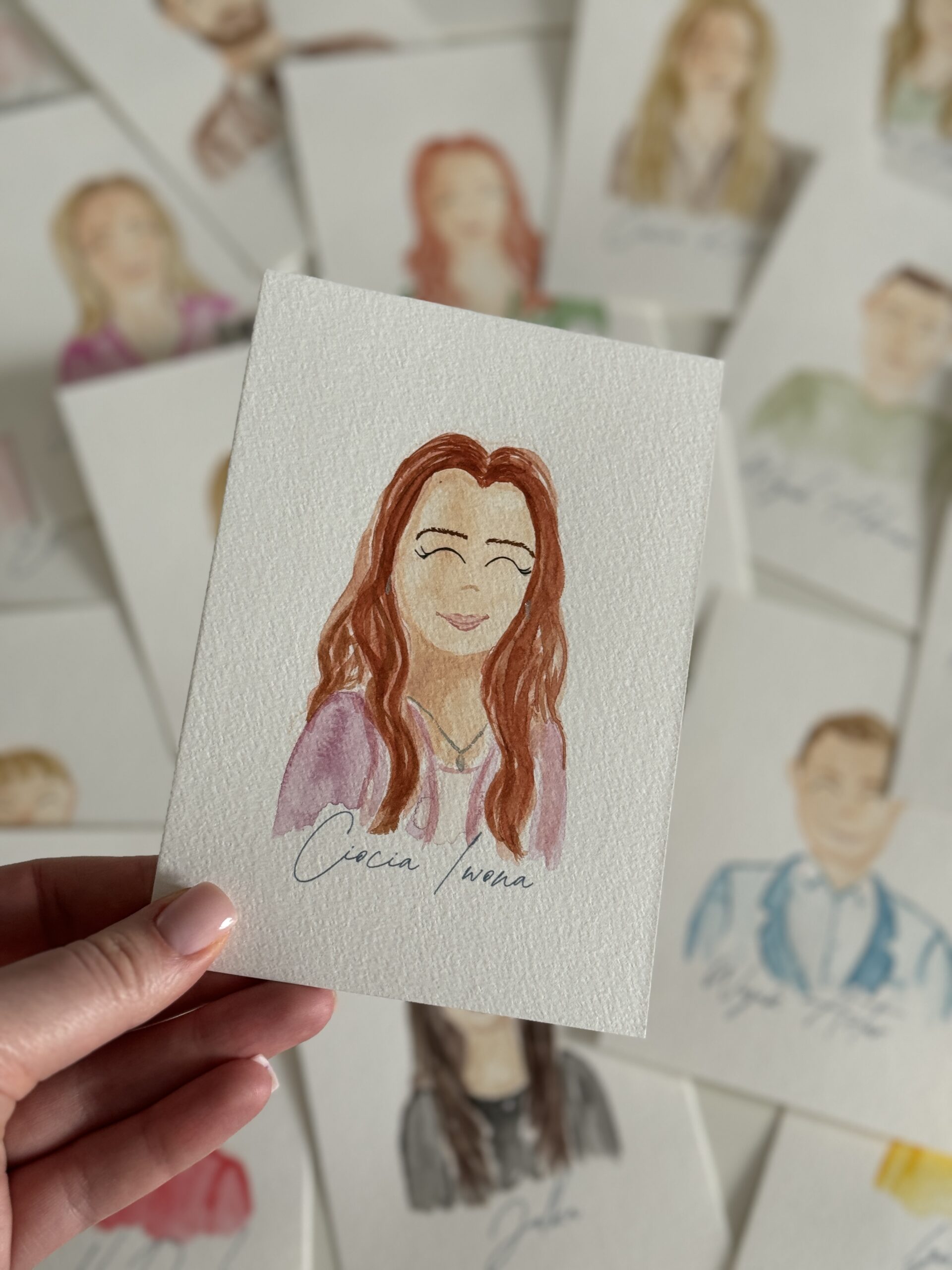 Mały portrecik ręcznie malowany akwarelami na podstawie przesłanego zdjęcia. Pomysł na spersonalizowaną winietkę na stół z podobizną osoby. Będzie wspaniałą niespodzianką oraz podziękowaniem dla gości.