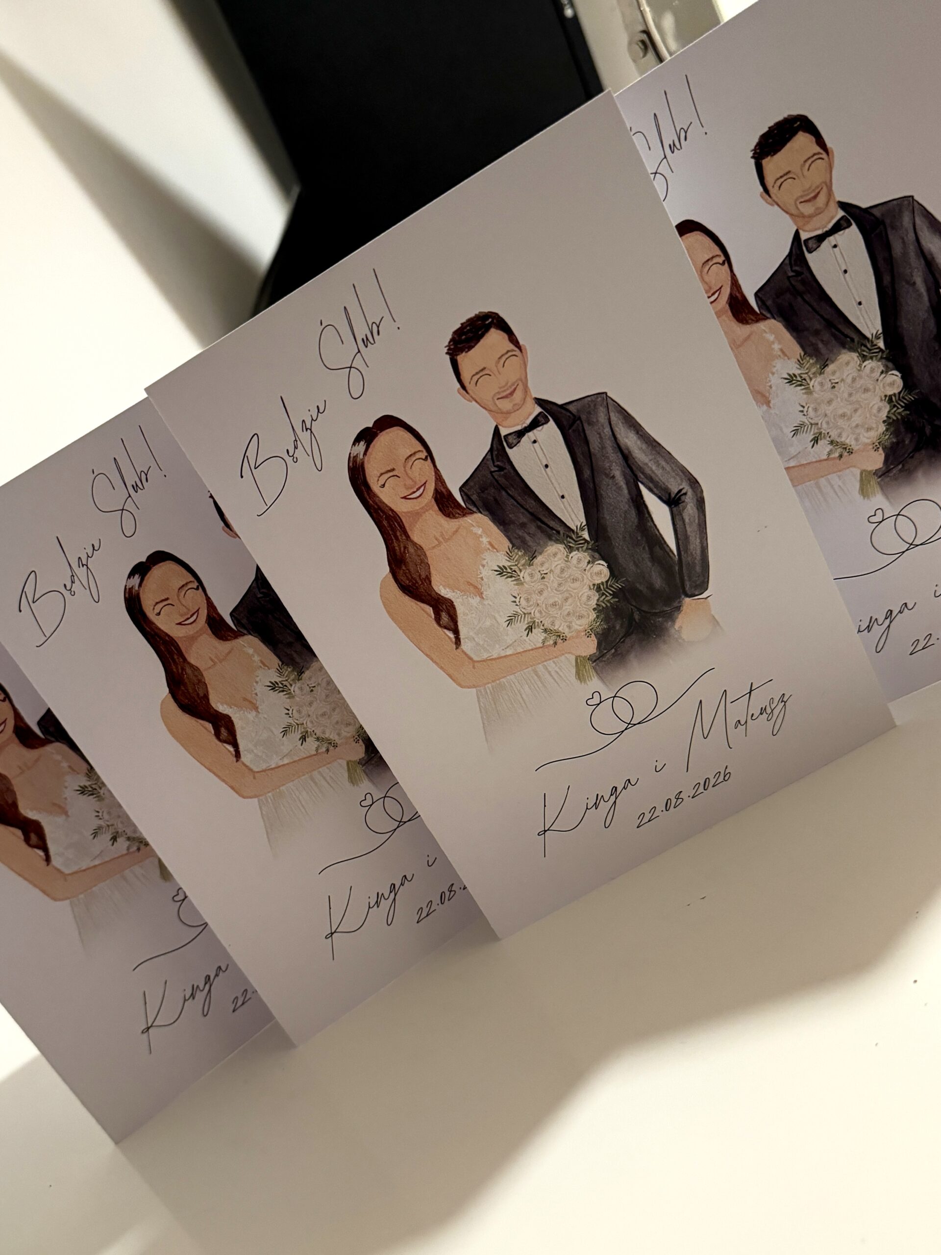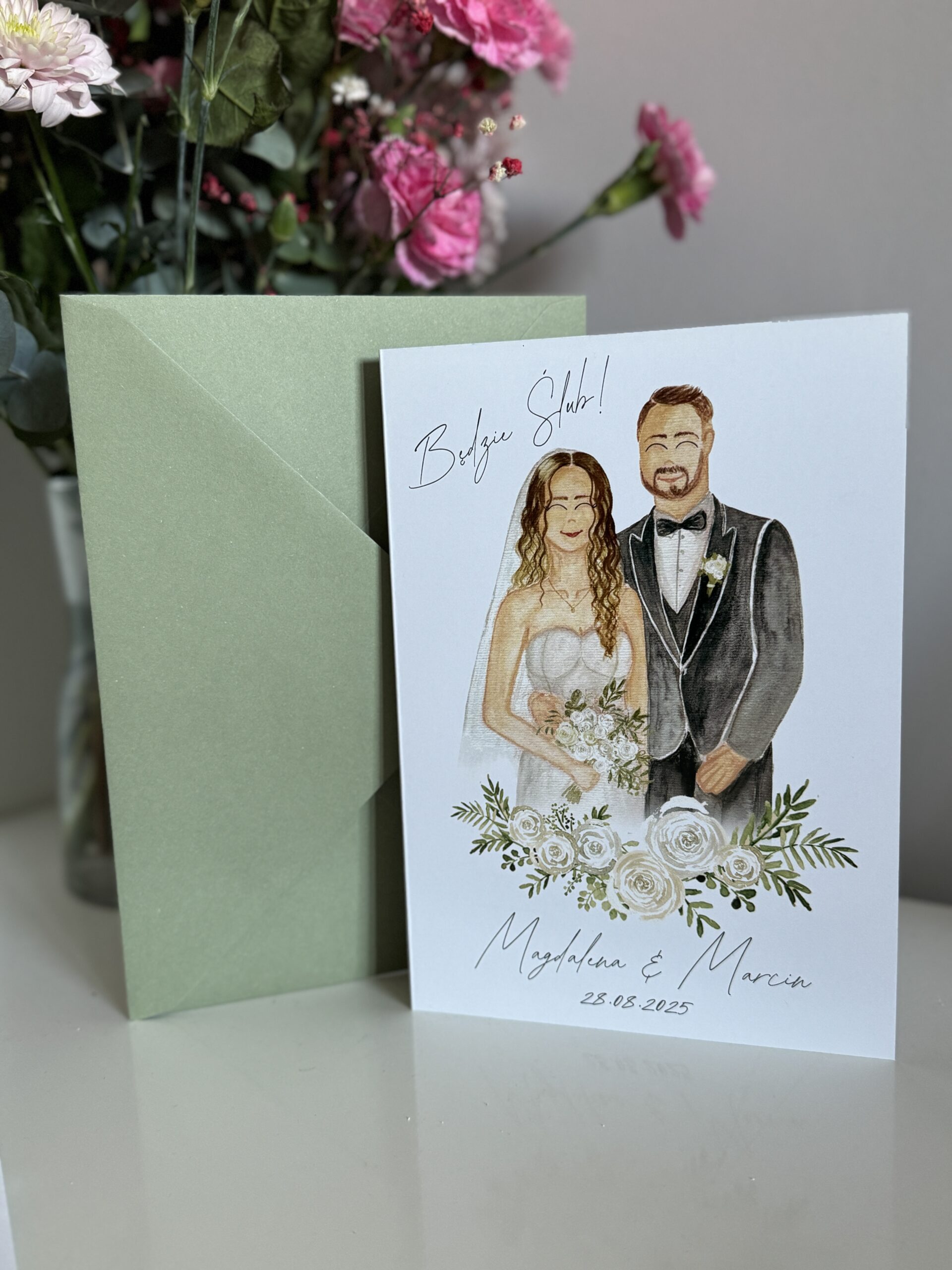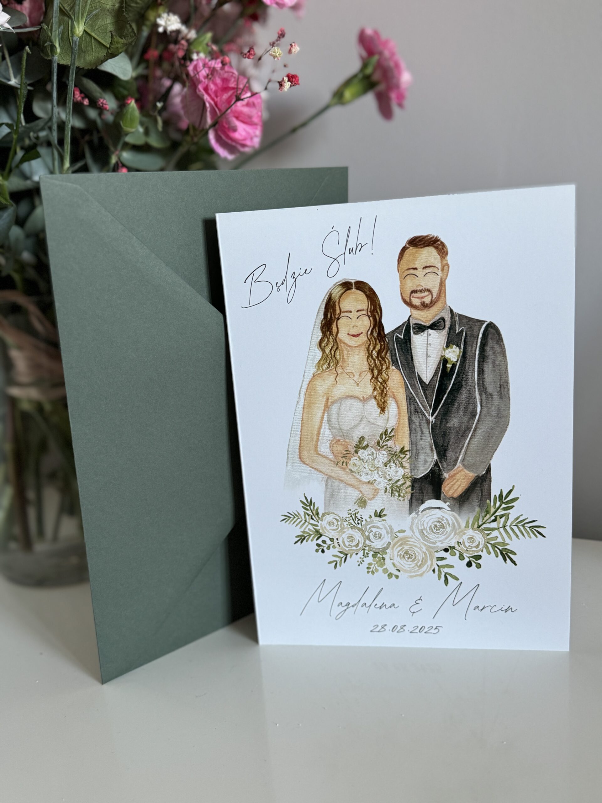 Papeteria z portretem Młodej Pary. Składa się ze składanego zaproszenia do rozmiaru A5.