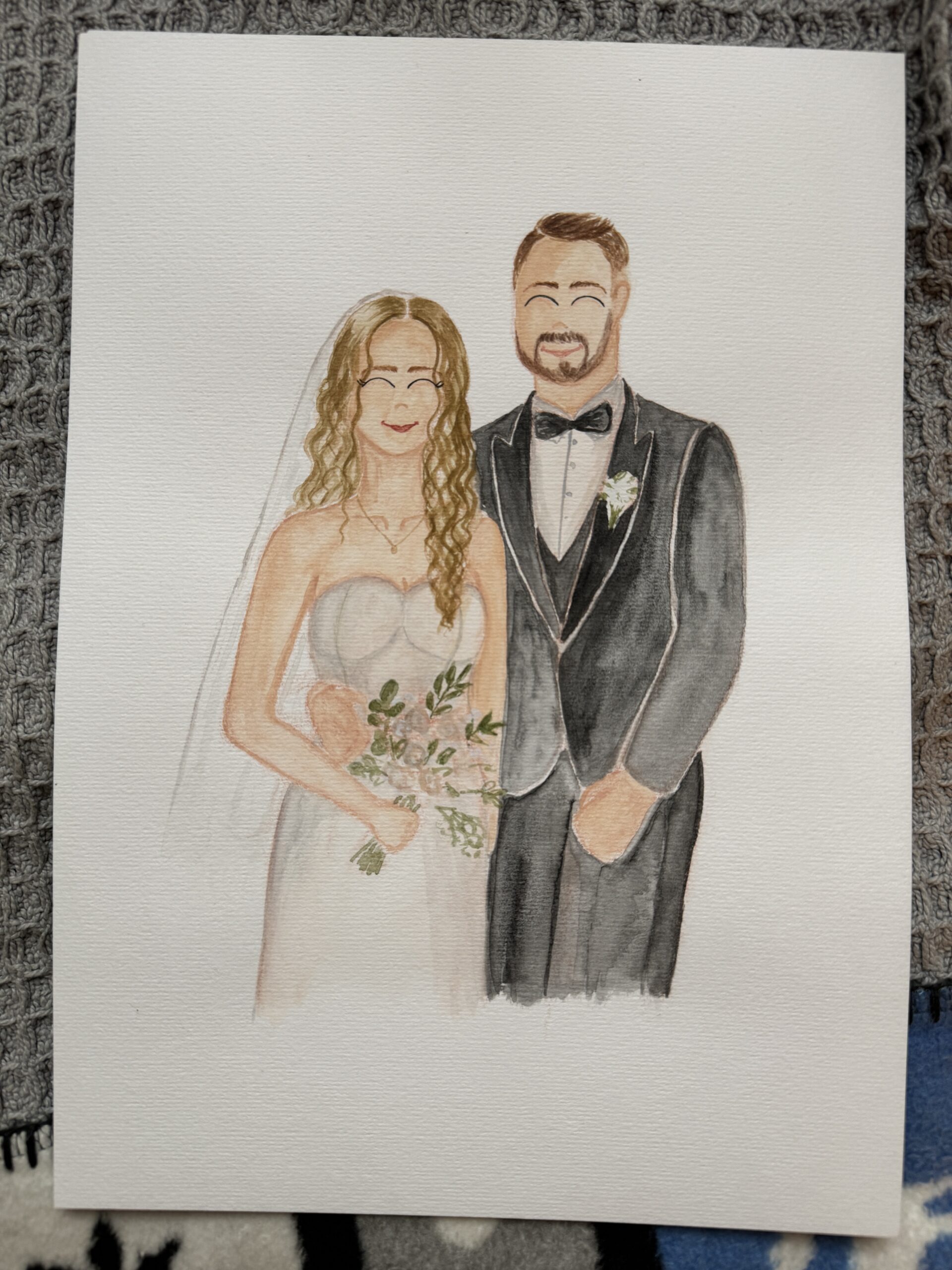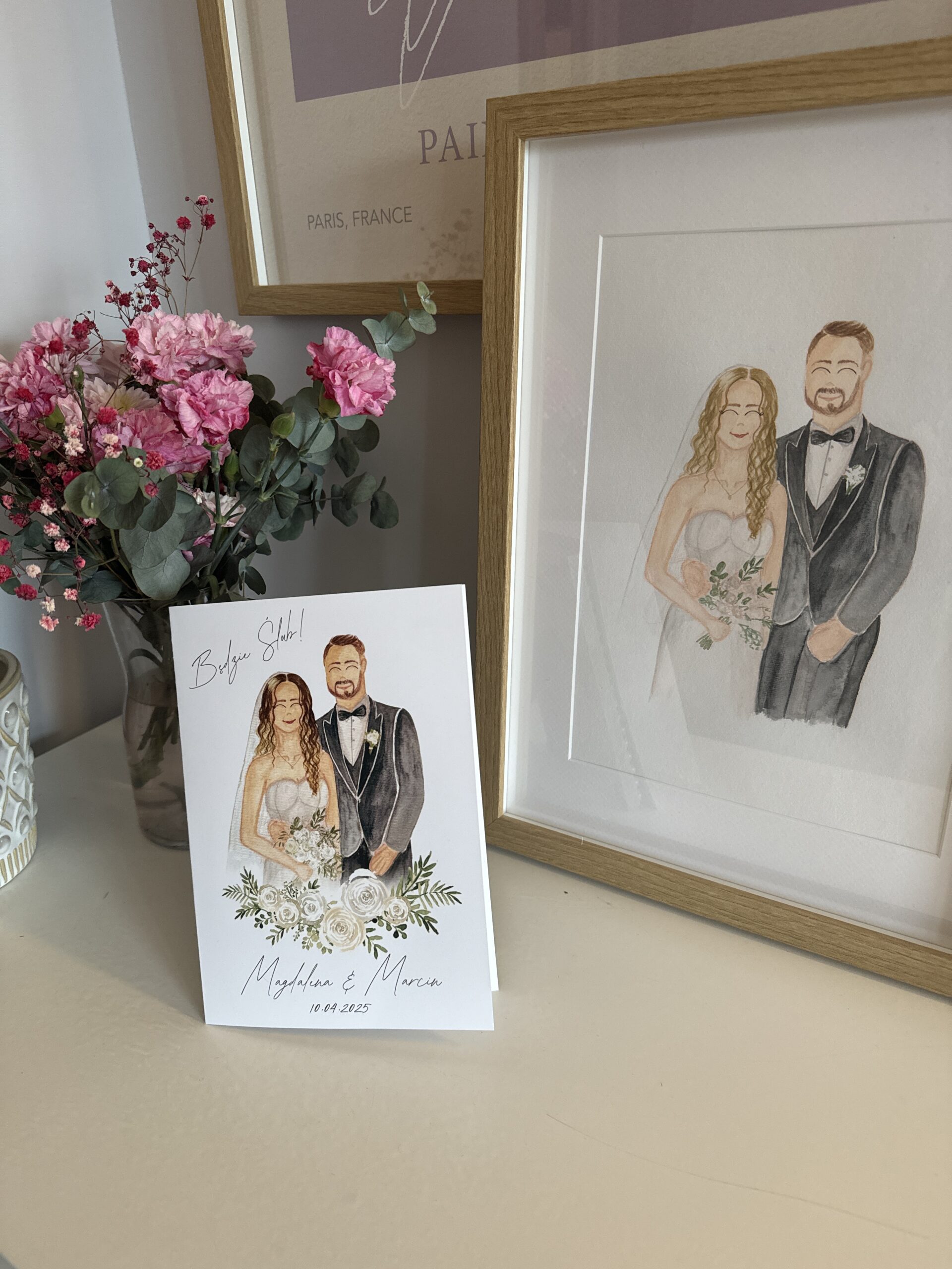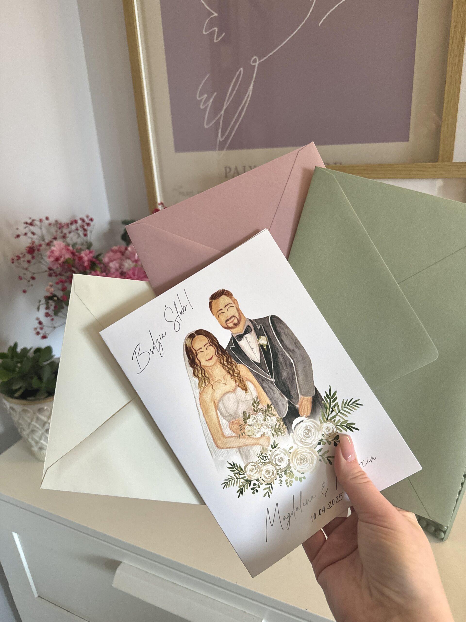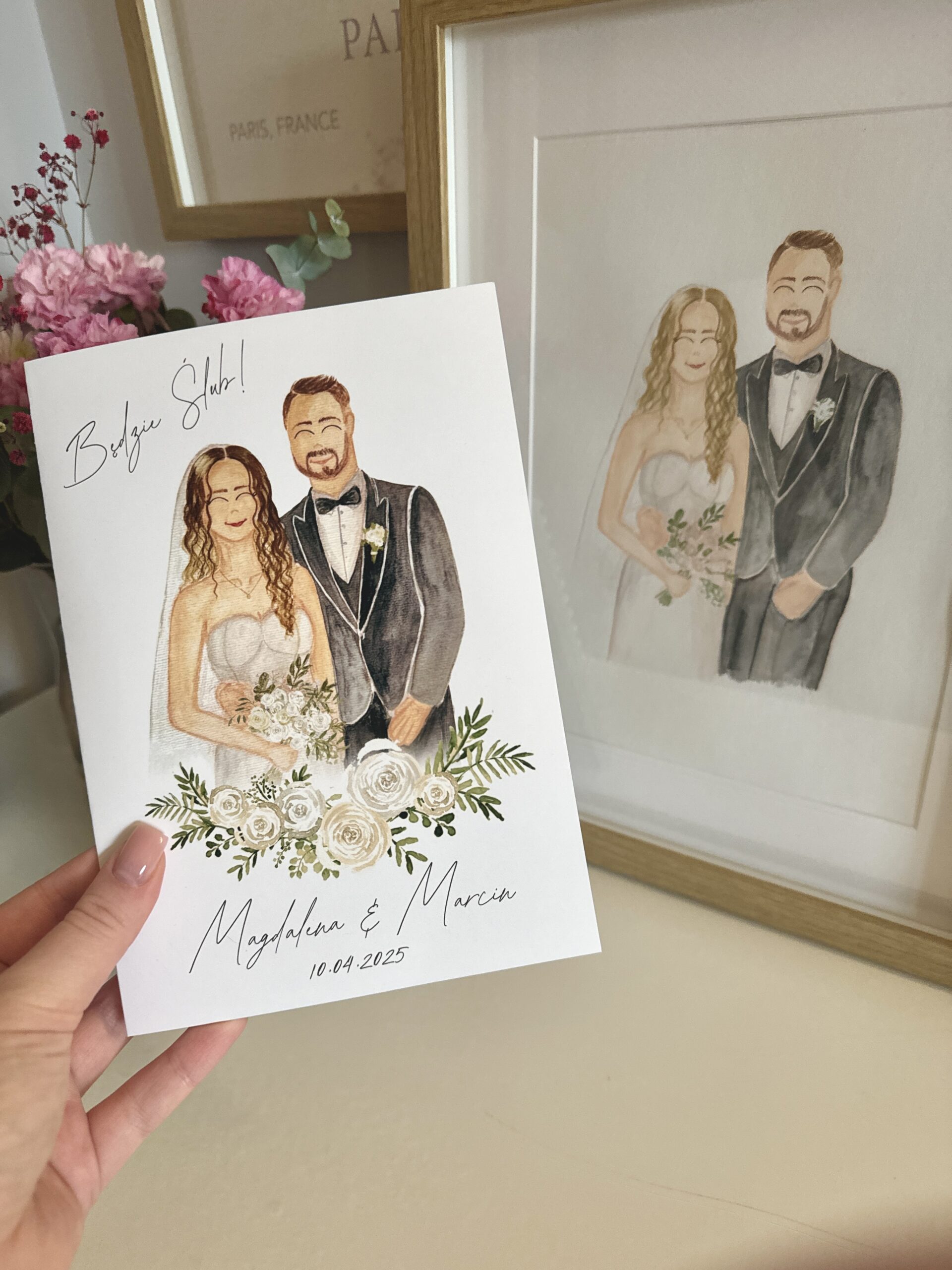 Papeteria z portretem Młodej Pary. Składa się ze składanego zaproszenia do rozmiaru A5.